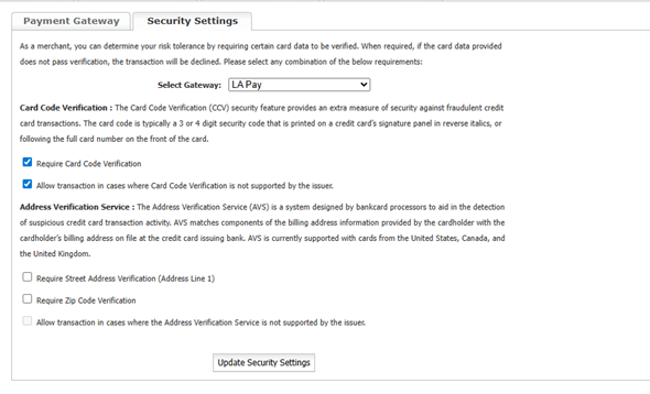 If you use LA Pay, you can adjust your card verification requirements to help block fraudulent transactions.