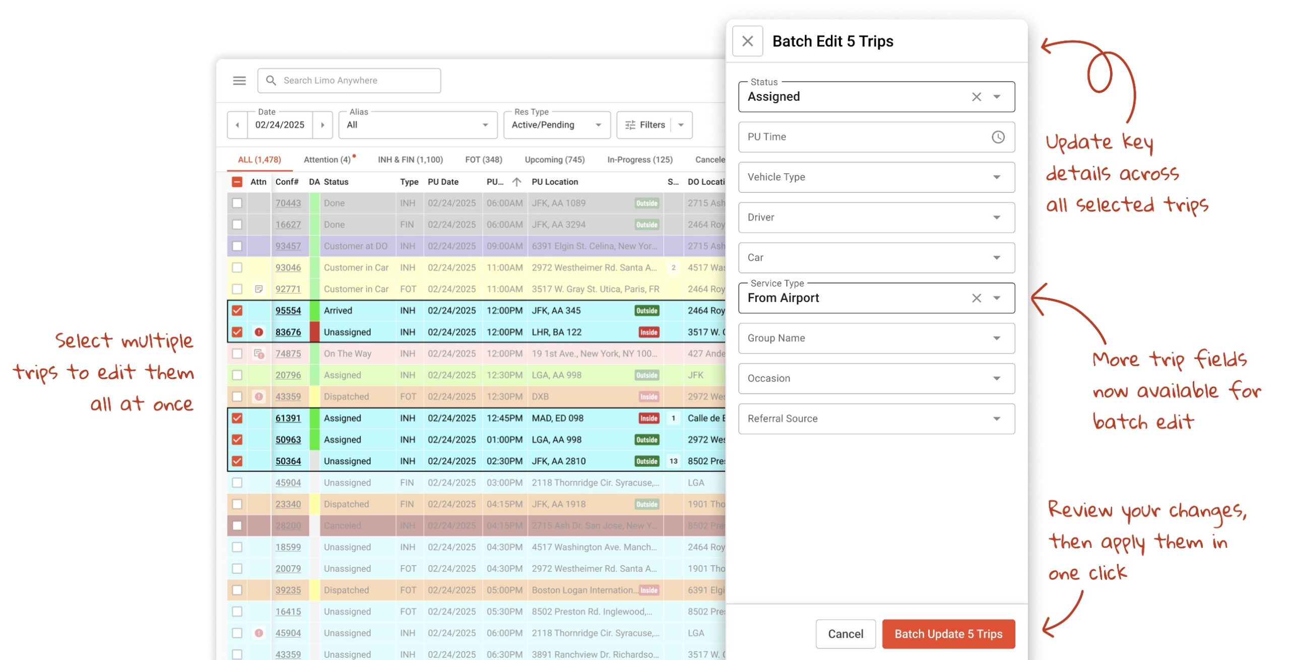 Select multiple trips and update them all at once (status, PU time, vehicle type, driver, car, service type, group name, occasion, referral source). Great for last minute changes or end of day cleanup.