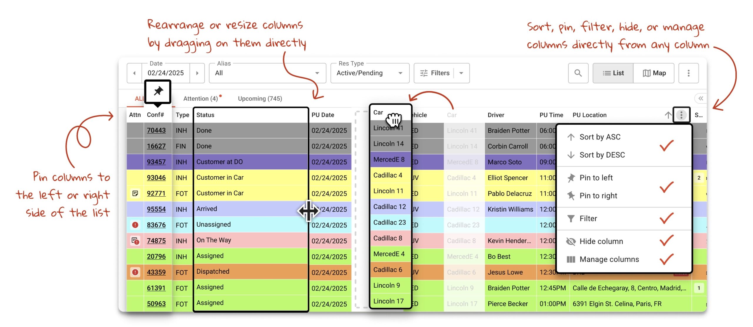 Sort any column, pin left/right, and drag reorder columns; and save as your default.