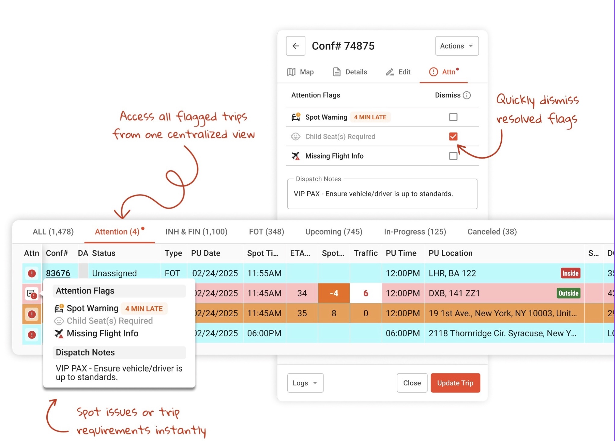- Catch issues early: Attention Flags pull special handling trips to the surface (e.g., flight info missing/unverified, meet & greet, child seats, accessible vehicle, driver rejected, lastminute booking, outstanding balance).