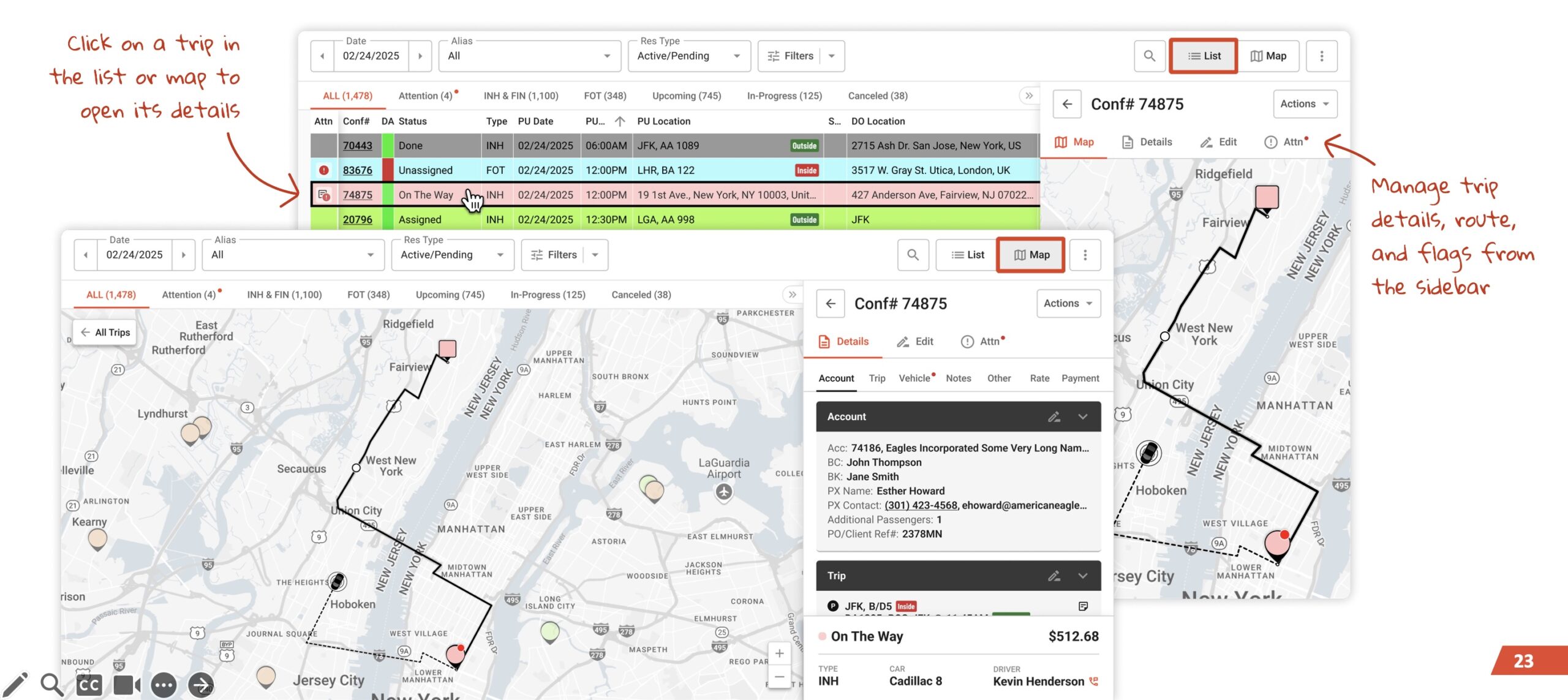 Toggle between a collapsible Map (clustered trips by location) and a sortable List to get instant context and take action without switching screens.