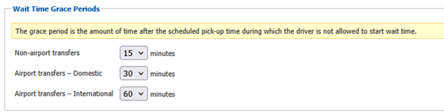Next, configure your grace periods. Grace periods define how long a chauffeur can wait after the scheduled pickup time before wait time becomes billable. These can be set separately for: